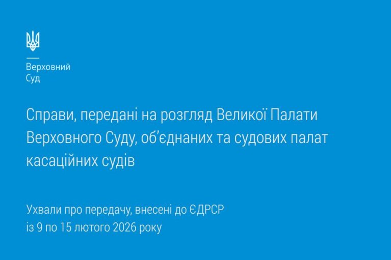 Цього тижня знайомимо вас зі справами, переданими на розгляд Великої Палати Верховного Суду, об’єднаних та судових палат касаційних судів відповідно до ухвал про передачу, внесених до ЄДРСР із 9 по 15 лютого 2026 року.