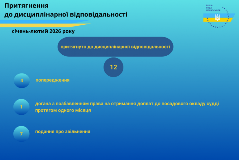 Протягом двох місяців 2026 року за результатами розгляду дисциплінарних справ Дисциплінарні палати Вищої ради правосуддя прийняли 12 рішень про притягнення до дисциплінарної відповідальності 12 суддів та застосування до них таких видів дисциплінарних стягнень: