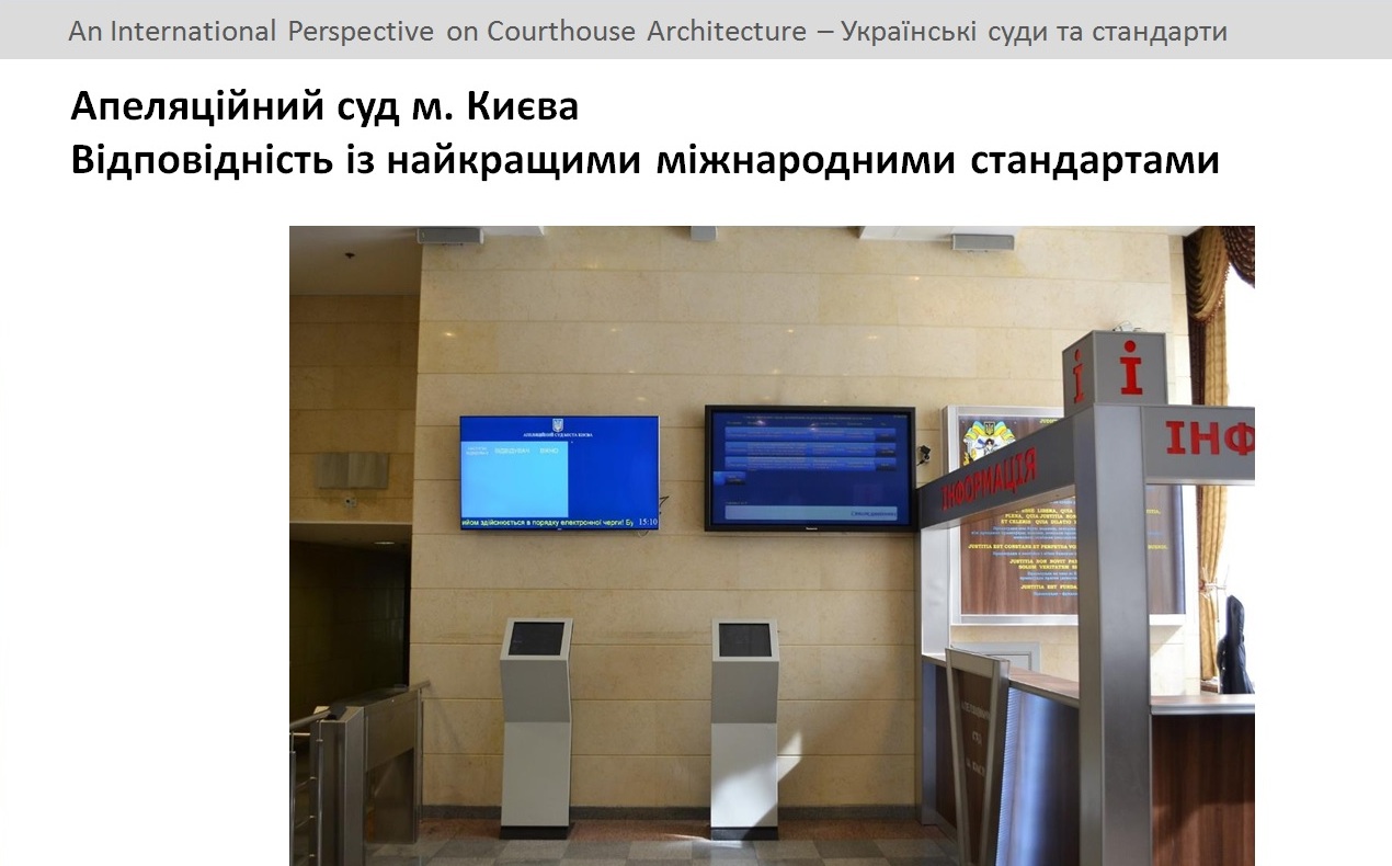 Зокрема, віце-президент Інституту судового управління та ад'юнкт-професор Університету штату Мічиган (Сполучені Штати Америки) Тім Діббл поділився власним досвідом глобального масштабу щодо архітектури будівель судових установ та навів приклади інноваційних рішень у судовому будівництві з практики США та Молдови. Пан Діббл доповів також про результати аналізу українських будівельних норм і правил, встановлених для будівництва судових установ, на предмет їх відповідності сучасним світовим стандартам. «Напередодні мені випала приємна нагода відвідати будівлю Апеляційного суду міста Києва. Хочу відзначити, що тут чітко відстежується прогресивна політика керівництва Апеляційного суду міста Києва, яка спрямована на відновлення довіри громадян до суду, підвищення комфортності та зручності умов перебування відвідувачів. У суді встановлено безкоштовний доступ до мережі Інтернет через Wi-Fi, приміщення суду обладнано стаціонарними універсальними зарядними пристроями для мобільних телефонів та планшетів, встановлено систему електронного керування чергою, що була запроваджена вперше серед судів України саме в Апеляційному суді міста Києва. Подібні інноваційні рішення, що пропонує столичний апеляційний суд у сфері взаємодії суду з громадянами, є необхідними, є вимогою часу, і приємно, що ця судова установа крокує у ногу з ним», – резюмував міжнародний експерт.