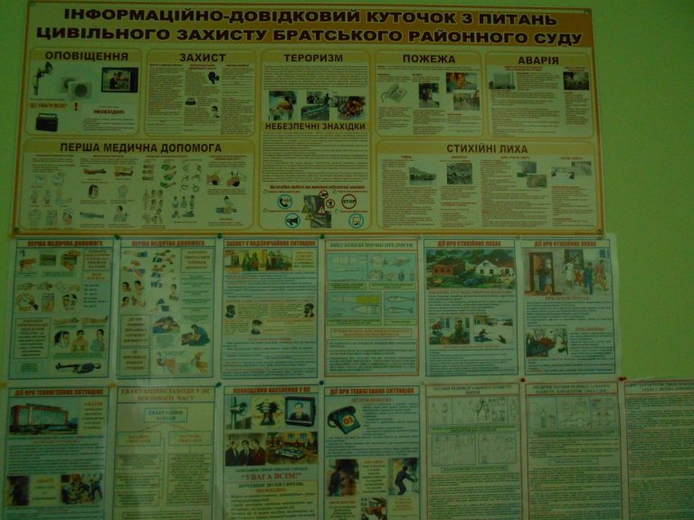 На виконання вимог ст. 40 Кодексу цивільного захисту, Порядку здійснення навчання населення діям у надзвичайних ситуаціях, затвердженого постановою Кабінету міністрів України № 444 від 26.06.2013 року, а також з метою оперативного реагування та захисту працівників і відвідувачів судової установи від впливу і наслідків надзвичайних ситуацій в приміщенні Братського районного суду Миколаївської області облаштовано інформаційно-довідковий куточок з питань цивільного захисту.