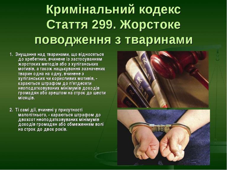04 травня 2018 року судом винесено обвинувальний вирок відносно громадянина С., який обвинувачується в жорстокому поводженні з тваринами (ч. 1 ст. 299 КК України) та призначено йому покарання у виді арешту строком 6 (шість) місяців.