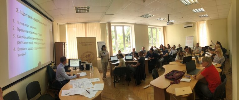 Майбутні судді в ході тренінгу вивчали зміст понять суддівської етики та доброчесності, необхідність дотримання норм міжнародного та національного законодавства й етичних норм поведінки судді під час відправлення правосуддя та поза межами зали судового засідання.